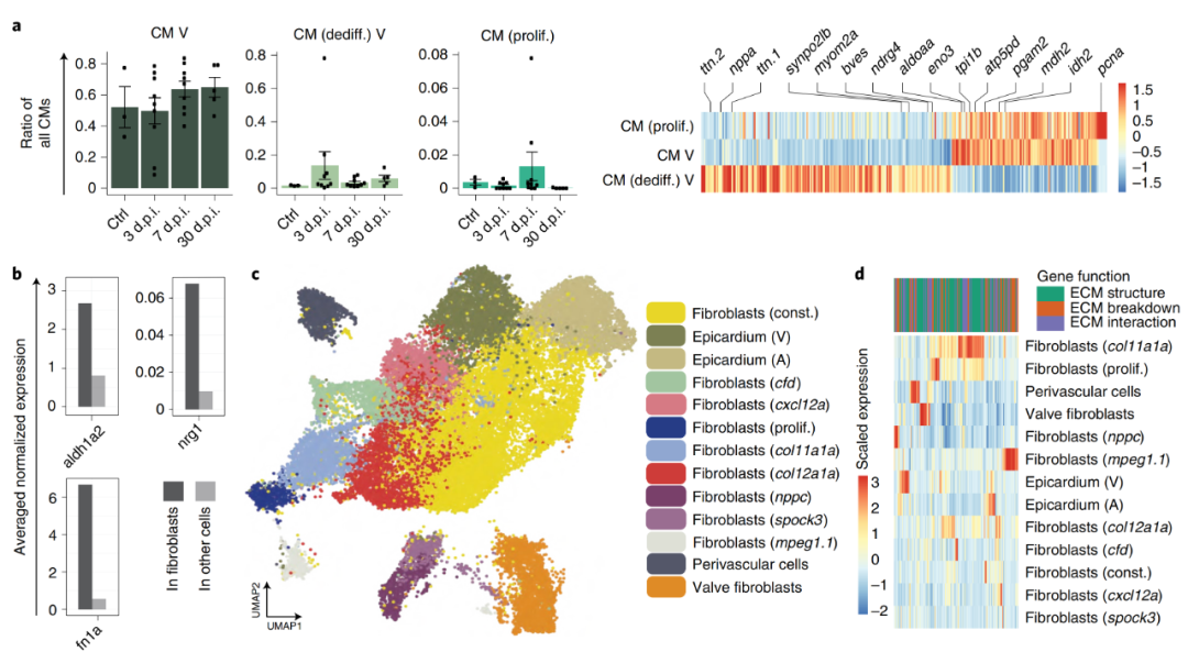作者注意到心臟再生中三個(gè)成熟的信號(hào)因子在成纖維細(xì)胞中高度富集:合成視黃酸的酶aldh1a2、心肌細(xì)胞有絲分裂原nrg1和再生細(xì)胞外基質(zhì)(ECM)因子fn1a(圖2b)。為了更詳細(xì)地研究心臟成纖維細(xì)胞的多樣性,作者對(duì)成纖維細(xì)胞進(jìn)行了亞群聚類(lèi)。結(jié)果顯示出驚人的多樣性,有13個(gè)轉(zhuǎn)錄上不同的成纖維細(xì)胞聚類(lèi)(圖2c)。這13個(gè)基因簇在ECM相關(guān)基因的表達(dá)譜上表現(xiàn)出明顯的差異(圖2d),但它們的轉(zhuǎn)錄組多樣性遠(yuǎn)不止于此——去除ECM相關(guān)基因后,可以高精度鑒定相同的成纖維細(xì)胞亞型。