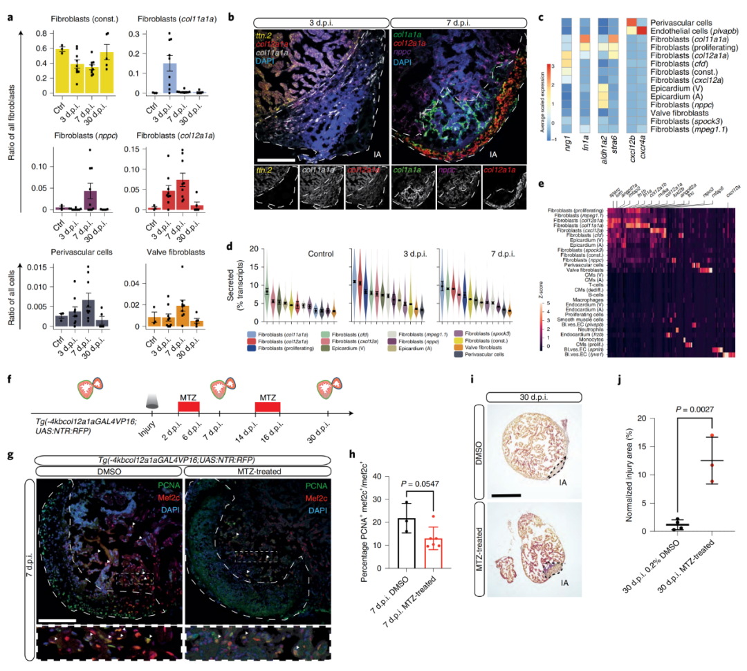 雖然作者對(duì)單細(xì)胞基因表達(dá)譜的時(shí)空分析強(qiáng)烈表明了瞬時(shí)成纖維細(xì)胞的再生功能,但還需要額外的實(shí)驗(yàn)來(lái)驗(yàn)證這一假設(shè)。為了從功能上評(píng)估瞬時(shí)col11a1a和col12a1a成纖維細(xì)胞的作用,作者使用硝基還原酶/甲硝唑(NTR/MTZ)系統(tǒng)進(jìn)行靶向細(xì)胞剔除。在MTZ處理后的轉(zhuǎn)基因系Tg(-4kbcol12a1a:GAL4VP16;UAS:NTR:RFP)中,在7 d.p.i.時(shí)相較于對(duì)照,5 / 6的心臟顯示心肌細(xì)胞增殖減少,col12aa表達(dá)細(xì)胞減少(圖3g,h)。在30d.p.i.時(shí),col12a1+細(xì)胞剔除顯著損害心臟再生(圖3i,j)??傊髡叽_定了心臟再生過(guò)程中具有潛在再生作用的三種成纖維細(xì)胞狀態(tài):col11a1a、col12a1a和nppc成纖維細(xì)胞?;蚣?xì)胞剔除數(shù)據(jù)強(qiáng)烈表明col12a1a表達(dá)細(xì)胞在再生生態(tài)位中發(fā)揮了作用。