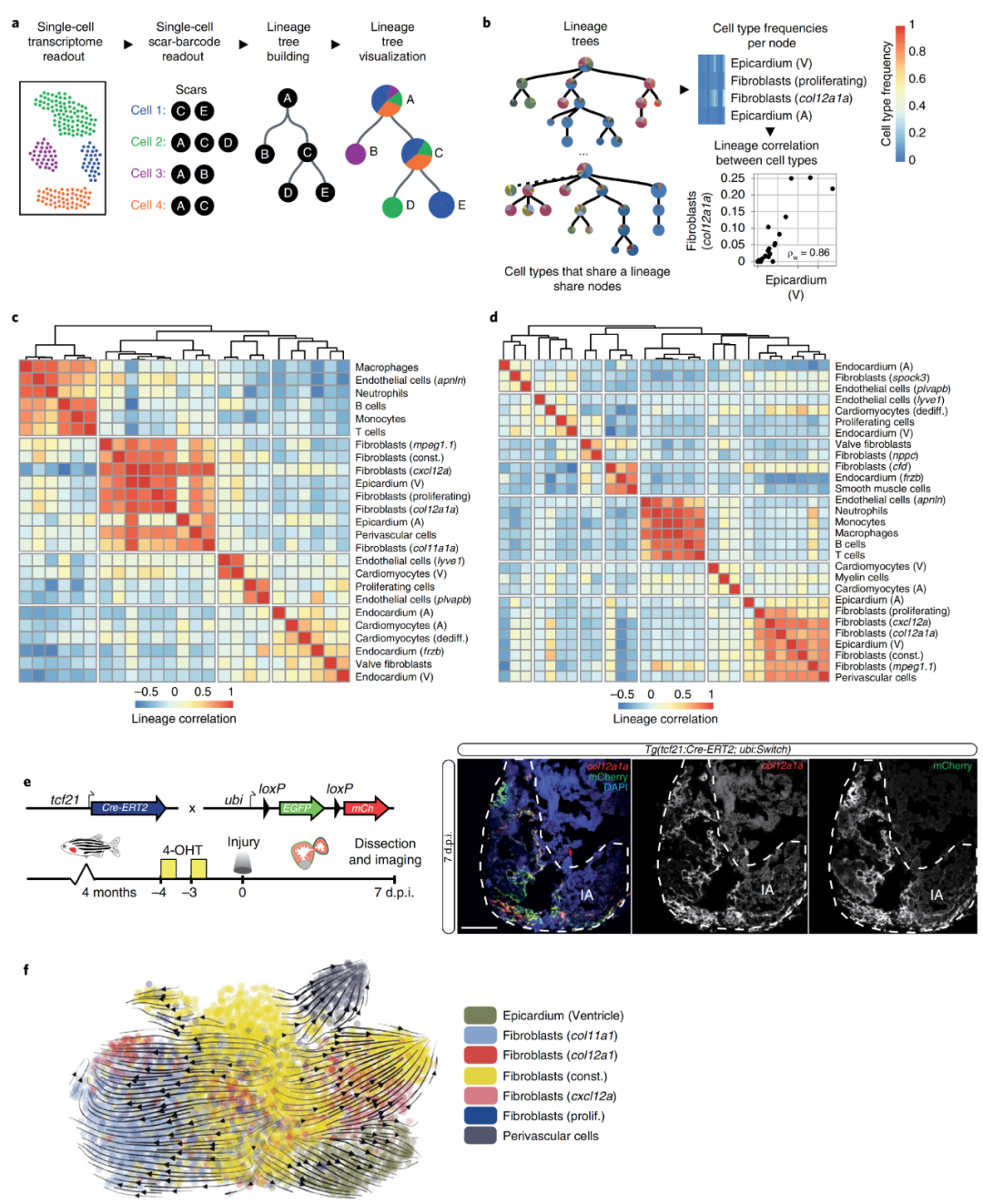 接下來(lái),作者想要闡明短暫成纖維細(xì)胞狀態(tài)的起源,以便更好地理解它們的激活機(jī)制。于是作者使用了基于CRISPR-Cas9技術(shù)的大規(guī)模平行譜系追蹤方法LINNAEUS。這種方法將細(xì)胞通過(guò)可遺傳的DNA條形碼(遺傳疤痕)標(biāo)記,它們由Cas9在早期發(fā)育過(guò)程中產(chǎn)生,其獨(dú)特的序列能夠識(shí)別疤痕產(chǎn)生時(shí)來(lái)自同一親本的細(xì)胞。通過(guò)對(duì)同一個(gè)單細(xì)胞的遺傳疤痕和轉(zhuǎn)錄組進(jìn)行測(cè)序,作者便可以建立譜系樹(shù),揭示這些細(xì)胞類(lèi)型的共同發(fā)育起源(圖4a)。在譜系樹(shù)中,一個(gè)節(jié)點(diǎn)中的所有細(xì)胞共享相同的發(fā)育祖先(比如圖4a,B和C節(jié)點(diǎn)就共享相同發(fā)育祖先A),并且每個(gè)節(jié)點(diǎn)上不同瞬時(shí)細(xì)胞狀態(tài)下的每個(gè)細(xì)胞均可在相同的上一節(jié)點(diǎn)中對(duì)應(yīng)找到(比如在圖4a的譜系圖中節(jié)點(diǎn)C就包含了3種瞬時(shí)細(xì)胞狀態(tài),這三種狀態(tài)下的所有細(xì)胞均可以在上一節(jié)點(diǎn)的對(duì)應(yīng)細(xì)胞狀態(tài)中找到)。作者還計(jì)算了不同樹(shù)節(jié)點(diǎn)中細(xì)胞類(lèi)型比率之間的相關(guān)性,以確定哪些細(xì)胞類(lèi)型通過(guò)譜系相關(guān)聯(lián)(圖4b)。譜系相關(guān)性聚類(lèi)熱圖顯示,在3 d.p.i.時(shí)有4簇細(xì)胞類(lèi)型,在7 d.p.i.時(shí)有7簇細(xì)胞類(lèi)型。在這兩個(gè)時(shí)間點(diǎn),所有的免疫細(xì)胞共享一個(gè)相同的譜系。此外,幾種成纖維細(xì)胞:col11a1a、col12a1a和構(gòu)成型成纖維細(xì)胞,它們和心外膜細(xì)胞聚集在一起,這表明這些成纖維細(xì)胞與心外膜細(xì)胞具有共同的發(fā)育起源(圖4c,d)。為了驗(yàn)證這一結(jié)論,作者又構(gòu)建了轉(zhuǎn)基因系TgBAC(tcf21:Cre-ERT2;ubi:Switch)。重組后,在7 d.p.i.表達(dá)的mCherry與內(nèi)源性表達(dá)的col12a1a共定位(圖4e),證實(shí)了瞬時(shí)col11a1a和col12a1a成纖維細(xì)胞為心外膜或心外膜衍生成纖維細(xì)胞的起源。為了進(jìn)一步闡明短暫心外膜成纖維細(xì)胞狀態(tài)的起源,作者應(yīng)用了RNA速度分析方法,對(duì)心外膜譜系簇中所有心室細(xì)胞類(lèi)型在3 d.p.i.和7 d.p.i.下的發(fā)育軌跡進(jìn)行推斷(圖4f),得到了相同的結(jié)論。