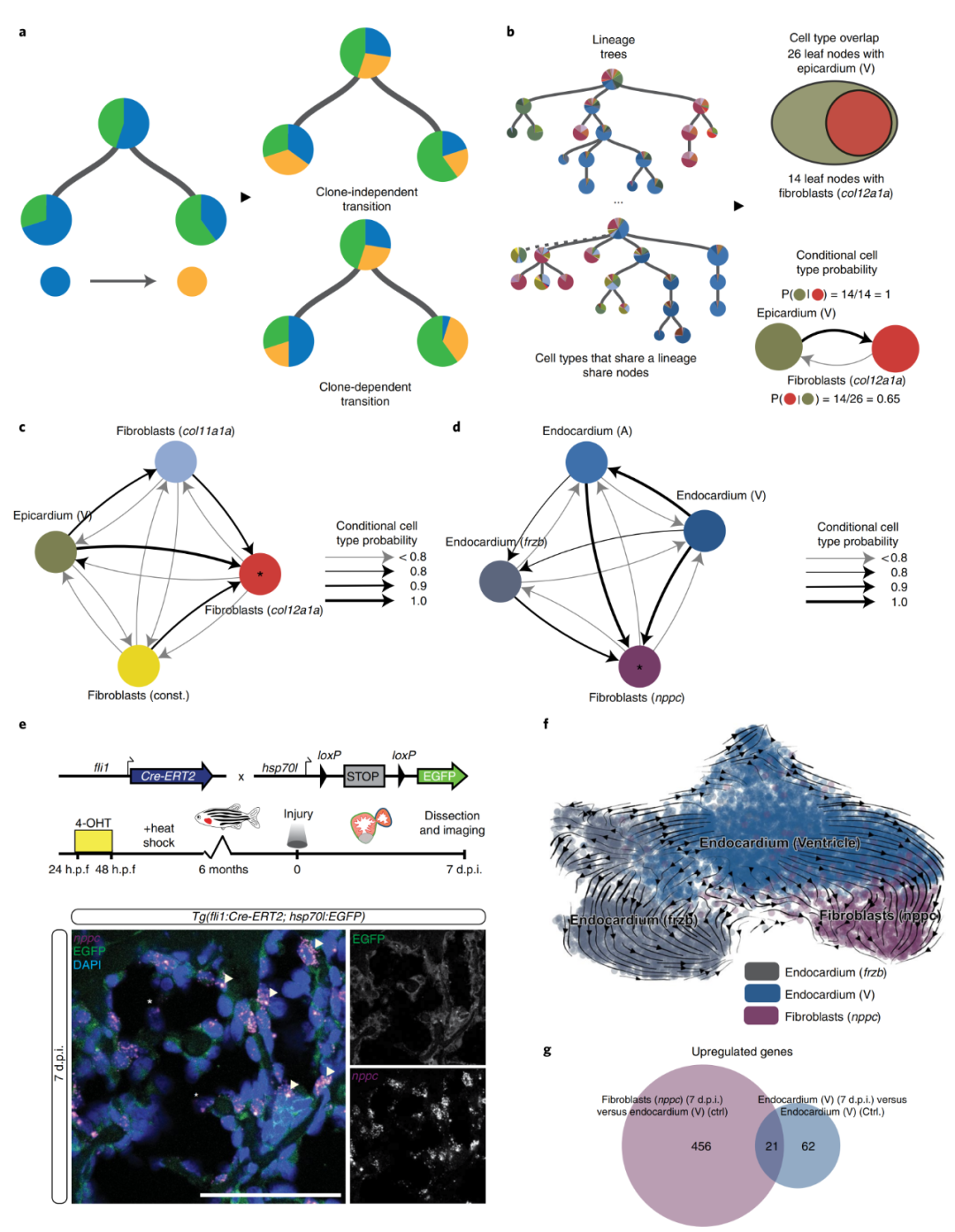 瞬時(shí)nppc成纖維細(xì)胞和其他幾個(gè)成纖維細(xì)胞亞型(spock3、cfd和瓣膜成纖維細(xì)胞)在3 d.p.i.或7 d.p.i.時(shí)不屬于心外膜譜系,但與心內(nèi)膜以及彼此之間顯示中度正相關(guān)?;谙嚓P(guān)性的分析有一個(gè)潛在的假設(shè),即所有克隆體都會(huì)表現(xiàn)出相似的轉(zhuǎn)換率(圖5a),但是這種假設(shè)并不適用于所有細(xì)胞類(lèi)型,于是作者引入條件概率開(kāi)發(fā)了第二種算法(圖5b)。在3 d.p.i.時(shí),不同成纖維細(xì)胞類(lèi)型:col11a1a成纖維細(xì)胞、構(gòu)成型成纖維細(xì)胞、心外膜(心室)轉(zhuǎn)變?yōu)?em>col12a1a成纖維細(xì)胞類(lèi)型的條件概率均大于0.9(圖5c)。在7 d.p.i. 時(shí),不同的心內(nèi)膜細(xì)胞類(lèi)型:心內(nèi)膜(心房)、心內(nèi)膜(心室)和心內(nèi)膜 ( frzb )轉(zhuǎn)變?yōu)?em>nppc成纖維細(xì)胞的條件概率均大于0.8,表明這種成纖維細(xì)胞類(lèi)型與心內(nèi)膜之間存在譜系關(guān)系。為了驗(yàn)證算法的真實(shí)性,作者構(gòu)建了轉(zhuǎn)基因系Tg(fli1:Cre-ERT2; hsp70l:Switch)。在7 d.p.i.表達(dá)的EGFP與內(nèi)源性表達(dá)的nppc共定位(圖5e),證實(shí)了瞬時(shí)nppc成纖維細(xì)胞的心內(nèi)膜起源。RNA速度分析揭示了心室內(nèi)膜和nppc成纖維細(xì)胞之間的轉(zhuǎn)錄相似性和潛在的過(guò)渡路徑(圖5f)。從單細(xì)胞轉(zhuǎn)錄組數(shù)據(jù)中觀察到,與健康對(duì)照組心臟相比,心內(nèi)膜在7 d.p.i.時(shí)發(fā)生了激活反應(yīng)(圖5g)。