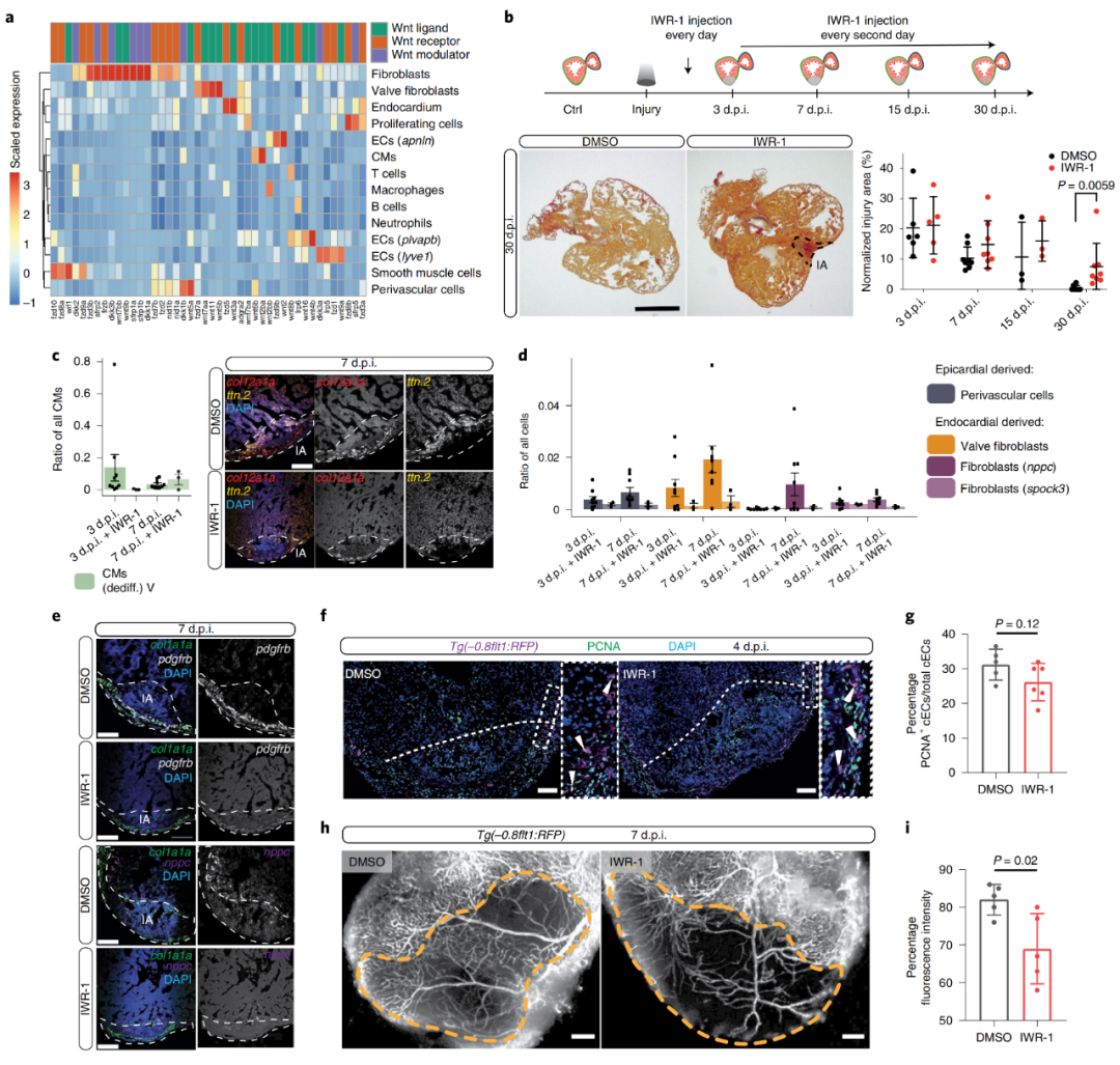 作者發(fā)現(xiàn)成纖維細(xì)胞中表達(dá)了許多與Wnt信號(hào)有關(guān)的基因(配體、受體和調(diào)節(jié)劑)(圖6a),于是這啟發(fā)了他們?nèi)パ芯縒nt信號(hào)在斑馬魚(yú)心臟再生過(guò)程中的作用。一方面,Wnt通常被認(rèn)為是一種促增殖因子,Wnt的激活已被證明對(duì)斑馬魚(yú)鰭和脊髓再生有益。另一方面,Wnt信號(hào)通路在心肌細(xì)胞去分化和增殖中的作用存在爭(zhēng)議。于是,作者在斑馬魚(yú)心臟冷凍損傷后,使用特征良好的Wnt/β-catenin依賴(lài)的信號(hào)抑制劑IWR-1抑制典型的Wnt信號(hào),并在3,7,15和30 d.p.i.觀察其影響。結(jié)果發(fā)現(xiàn),Wnt/β-catenin信號(hào)通路抑制導(dǎo)致心臟再生顯著延遲,與對(duì)照組相比,心肌纖維化延長(zhǎng),損傷面積增大(圖6b)。IWR-1處理后心臟的單細(xì)胞轉(zhuǎn)錄組數(shù)據(jù)顯示心肌細(xì)胞去分化延遲,與對(duì)照組相比,去分化心肌細(xì)胞數(shù)量在3 d.p.i.時(shí)減少,而在7 d.p.i.時(shí)未定位于損傷區(qū)域(圖6c)。Wnt抑制后,血管周細(xì)胞和所有心內(nèi)膜成纖維細(xì)胞(nppc、spock3和瓣膜成纖維細(xì)胞)的水平顯著降低,而其他短暫增加的成纖維細(xì)胞總體上保持在類(lèi)似水平(圖6d)。通過(guò)熒光原位雜交也證實(shí)了,Wnt信號(hào)對(duì)于心內(nèi)膜成纖維細(xì)胞的激活是必需的,類(lèi)似于所描述的Wnt在誘導(dǎo)小鼠內(nèi)皮細(xì)胞向間充質(zhì)細(xì)胞轉(zhuǎn)化中的作用。