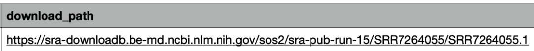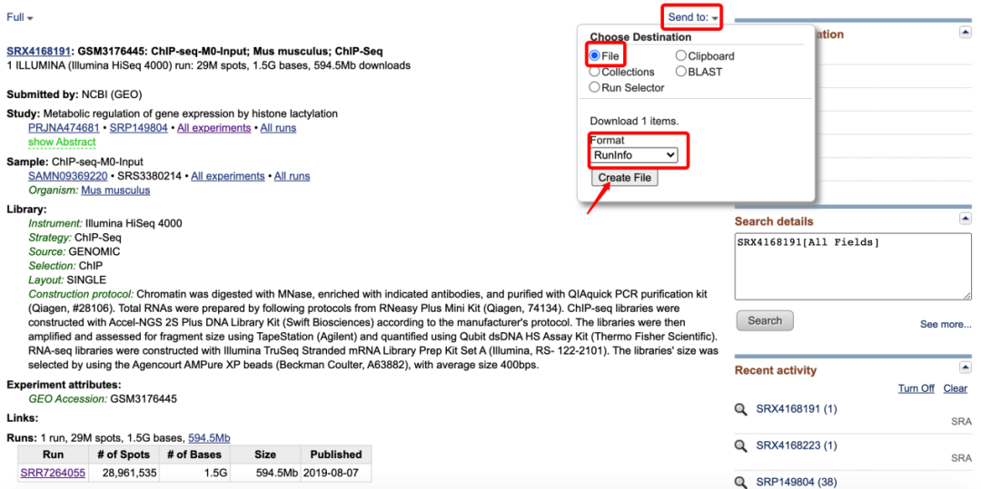 這里面包含了這個(gè)樣本的基本信息,包括測序平臺、文庫類型、數(shù)據(jù)量等基本信息,然后點(diǎn)擊頁面右上方的Send to按鈕,選擇File,F(xiàn)ormat選擇RunInfo,然后點(diǎn)擊Creat file下載一個(gè)csv文件,打開文件,可以看到一個(gè)下載鏈接