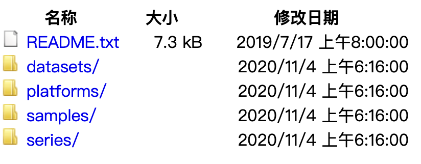 d)?GEO Dataset (GDS) 數(shù)據(jù)集的ID號這些數(shù)據(jù)均可以在ftp(ftp://ftp-trace.ncbi.nih.gov/geo/)進(jìn)行下載。