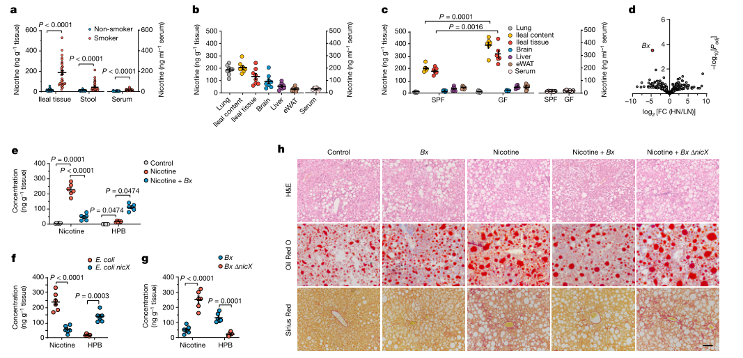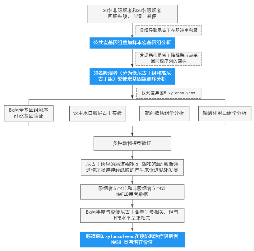 該研究發(fā)現(xiàn)尼古丁在吸煙期間在腸道中積聚并加速NAFLD的進(jìn)展,但它可以被人類共生菌B. xylanisolvens 有效降解。揭示了了腸道尼古丁積累的病理影響,并確定了一種內(nèi)源性尼古丁降解腸道細(xì)菌,該細(xì)菌對預(yù)防和治療吸煙者的 NASH 具有潛在價值。