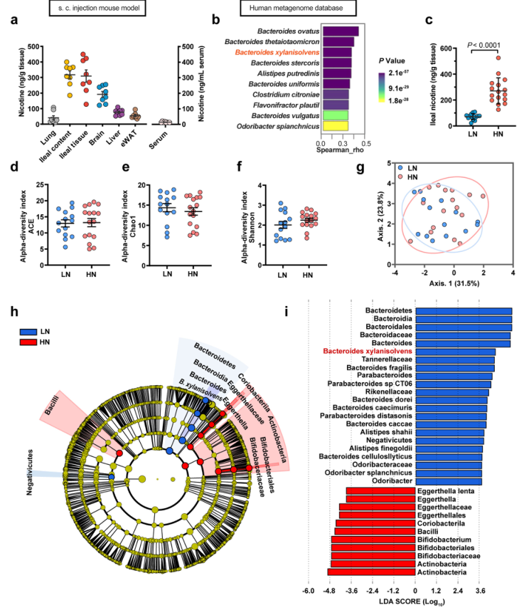圖 1.鑒定腸道尼古丁積累和腸道細(xì)菌介導(dǎo)的的腸道尼古丁降解。