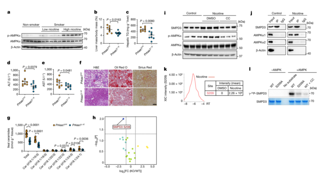 脂質(zhì)被認(rèn)為在 NAFLD 進(jìn)展中具有重要作用,因為它們是該病理學(xué)中腸道和肝臟之間串?dāng)_的關(guān)鍵介質(zhì)。研究者進(jìn)一步對回腸進(jìn)行了靶向脂質(zhì)組學(xué)分析,并確定神經(jīng)酰胺是導(dǎo)致Prkaa1基因敲除(KO)和對照(WT)腸上皮在尼古丁治療下基于聚集分化的主要代謝物(擴(kuò)展數(shù)據(jù)圖5n,o)。在尼古丁飲用模型中沒有腸道 AMPKα1 的情況下,回腸神經(jīng)酰胺譜較低(圖 2g)。基于尼古丁飲用模型回腸上皮的磷酸化蛋白質(zhì)組分析(擴(kuò)展數(shù)據(jù)圖 5p),腸上皮AMPKα1的缺失顯著降低了SMPD3的Ser208位的磷酸化(圖2H和擴(kuò)展數(shù)據(jù)圖5Q)。