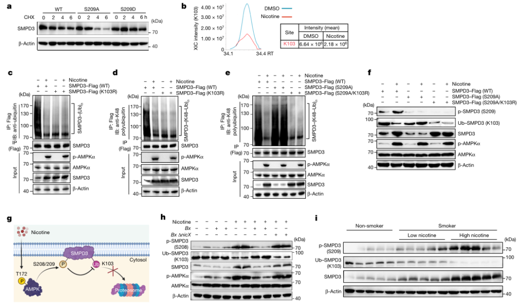 此外,在尼古丁處理的SW480細(xì)胞中,SMPD3在Lys103處的去泛素化程度顯著高于DMSO處理的細(xì)胞(圖3B和擴(kuò)展數(shù)據(jù)圖6G)。通過免疫沉淀,我們發(fā)現(xiàn)泛素化的SMPD3(Lys103)主要包含經(jīng)典的Lys48-連接Ub鏈(Lys48-Ub),而不是Lys63-Ub,后者被尼古丁處理減少(圖3C,d和擴(kuò)展數(shù)據(jù)圖6h)。S209A突變逆轉(zhuǎn)了尼古丁誘導(dǎo)的SMPD3 Lys48-Ub的減少,K103R突變進(jìn)一步緩解了這一下降(圖3e和擴(kuò)展數(shù)據(jù)圖6i)。此外,開發(fā)了抗p-SPMD3(S209)和抗Ub-SMPD3(Lys103)抗體(擴(kuò)展數(shù)據(jù)圖6J,k),并證實尼古丁誘導(dǎo)的總SMPD3蛋白的增加是由于SMPD3磷酸化水平升高,隨后泛素化減少(圖3F)。