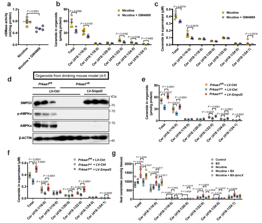SMPD3被認(rèn)為是代謝性疾病的病理加速器。將SMPD3抑制劑GW4869應(yīng)用于有機化合物以抑制SMPD3活性。GW4869降低了尼古丁處理下類器官及其上清液中的神經(jīng)酰胺水平。慢病毒表達(dá)的SMPD3被用于從尼古丁飲用模型恢復(fù)Prkaa1基因敲除的回腸器官中SMPD3的表達(dá)。正如預(yù)期的那樣,SMPD3的過表達(dá)逆轉(zhuǎn)了由于回腸器官中AMPKα1缺乏而導(dǎo)致的神經(jīng)酰胺水平的降低。在尼古丁加速的NASH小鼠模型中,在B. xylanisolvens存在的情況下,被B.xylansolvens定植的SPF小鼠回腸神經(jīng)酰胺減少,這是由于腸道p-AMPKα-SMPD3軸被抑制所致。