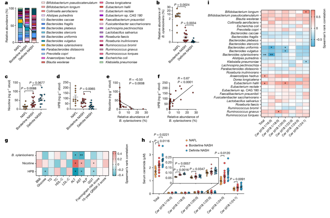 為了闡明我們的發(fā)現(xiàn)與人類NAFLD進(jìn)展之間的相關(guān)性,我們收集了83名經(jīng)活檢證實的NAFLD患者的數(shù)據(jù),這些患者被分為吸煙者(n=41)和非吸煙者(n=42)。在吸煙者中,NAFL、Borderline NASH和Defined NASH在煙草吸煙史(包括吸煙年限和每天吸煙數(shù)量)方面沒有顯著差異。然而,我們發(fā)現(xiàn)B.xylansolvens水平與NAFLD嚴(yán)重程度呈負(fù)相關(guān),隨著NAFLD的進(jìn)展,糞便中尼古丁水平逐漸增加,糞便中尼古丁降解產(chǎn)物HPB相應(yīng)地隨著NAFLD的進(jìn)展而減少(圖4C,d)。在吸煙者中,B.xylansolvens豐度與糞便尼古丁含量呈負(fù)相關(guān),但與HPB水平呈正相關(guān)(圖4e,f)。