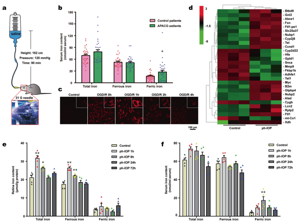2. 體外和體內(nèi)實驗證實了,ph-IOP可以在損傷早期導(dǎo)致細胞和視網(wǎng)膜內(nèi)二價鐵離子異常積累,損傷后8h血清中三價鐵離子水平升高;