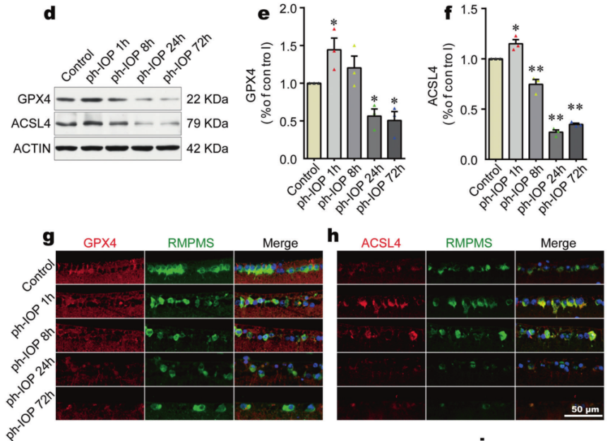 為了驗證PH-IOP損失引起的視網(wǎng)膜鐵積累可能導(dǎo)致視網(wǎng)膜鐵死亡這一假設(shè),測量了氧化應(yīng)激相關(guān)生化指標,發(fā)現(xiàn)Ph-IOP損傷早期階段MDA含量顯著增加,而GSH和NADPH水平顯著降低;進一步檢測鐵死亡核心標志物GPX4(抑鐵死亡因子)和ACSL4(促鐵死亡因子)發(fā)現(xiàn),ph-IOP 損傷后24h,GPX4水平降低,在PH-IOP損傷后1h,ACSL4水平上調(diào)(圖3d-f);并且這些鐵死亡相關(guān)蛋白的變化主要集中在視網(wǎng)膜內(nèi)層,尤其是神經(jīng)節(jié)層(圖3g, h),提示鐵死亡誘導(dǎo)的細胞損傷可能集中在 RGC 中(位于視網(wǎng)膜最內(nèi)層);TEM檢測發(fā)現(xiàn)PH-IOP引起RGC線粒體收縮和線粒體膜密度增加,表明ph-IOP誘導(dǎo)的視網(wǎng)膜鐵累積導(dǎo)致視網(wǎng)膜鐵死亡,特別是在 RGC中。