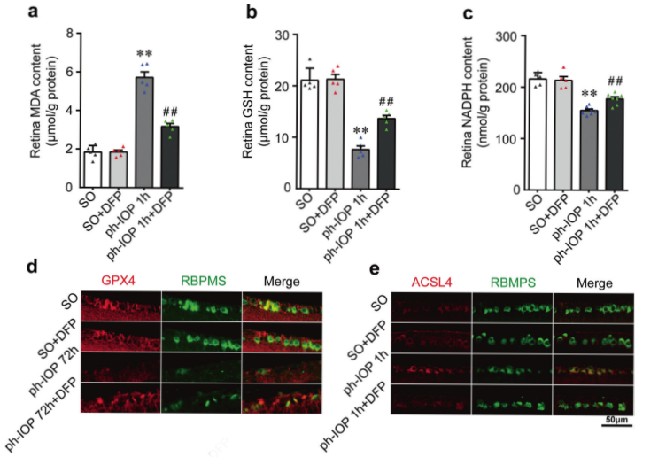 去鐵酮DPF作為鐵螯合劑目前已應(yīng)用于臨床治療鐵超負荷疾病,阻止患者血清鐵的蓄積。進一步研究DFP對ph-IOP損傷小鼠鐵代謝的影響。體內(nèi)體外結(jié)果顯示,DFP處理可以顯著降低 ph-IOP誘導(dǎo)的視網(wǎng)膜二價鐵累積;DFP治療可降低ph-IOP損傷后視網(wǎng)膜MDA含量(圖4a),增加GSH和NADPH水平(圖5b, c );此外,在ph-IOP損傷小鼠中,DFP處理恢復(fù)了GPX4水平,并降低了ACSL4水平(圖5d-e)。以上結(jié)果表明,DFP可以改善ph-IOP誘導(dǎo)的視網(wǎng)膜鐵死亡。