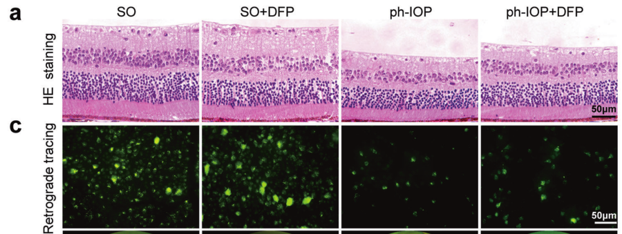 H&E染色結(jié)果顯示,Ph-IOP損傷導(dǎo)致顯著的RGC丟失和視功能損害;接著從形態(tài)學和功能上驗證了DFP對RGC的藥理作用,在 ph-IOP 損傷后5天,DFP處理減弱了神經(jīng)節(jié)細胞復(fù)合體(GCC)厚度,并增加了RGC數(shù)量(FG標記RGC形態(tài))。這些結(jié)果表明,DFP在ph-IOP損傷后保護 RGC 損傷,因此使用DFP抑制鐵死亡是治療ph-IOP誘導(dǎo)的RGC 損失的有效治療策略。