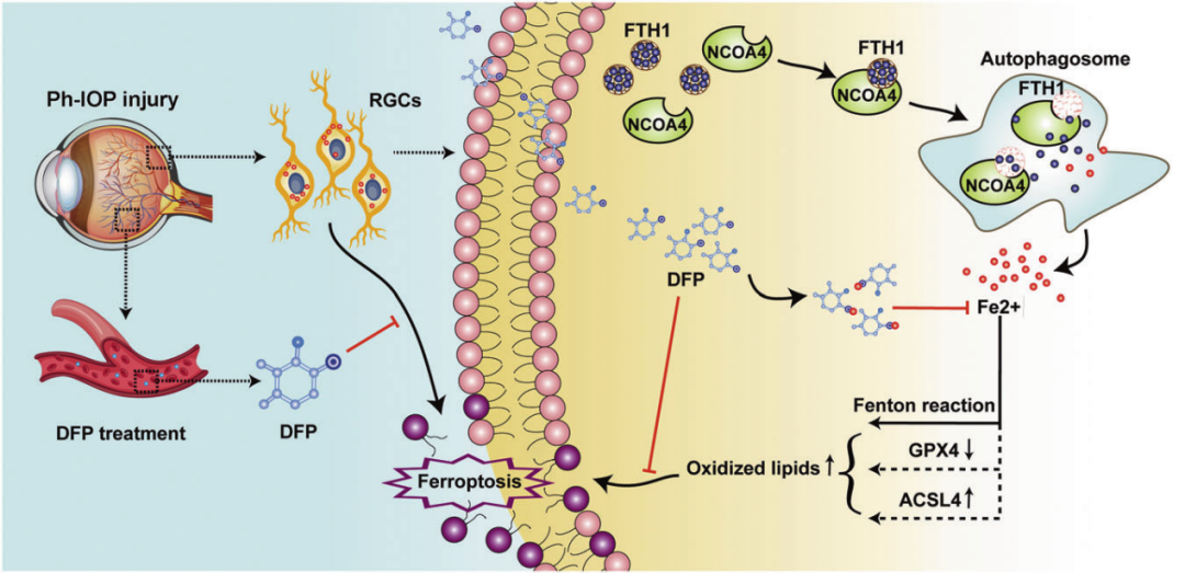 在生理狀態(tài)下,細胞內(nèi)鐵處于動態(tài)平衡狀態(tài),但在病理狀態(tài)下,這種平衡會被打破。Ph-IOP 損傷可以激活RGC細胞內(nèi)的NCOA4,激活的NCOA4將結(jié)合FTH1并觸發(fā)溶酶體降解FTH1(稱為鐵自噬)。降解的FTH1會釋放大量的游離鐵離子,這種具有氧化還原活性的金屬會進一步參與脂質(zhì)過氧化。最終,由鐵引起的脂質(zhì)過氧化氫的積累導(dǎo)致RGC鐵死亡,但口服DFP可以螯合細胞內(nèi)多余的游離鐵離子,抑制ph-IOP誘導(dǎo)的RGC鐵死亡。