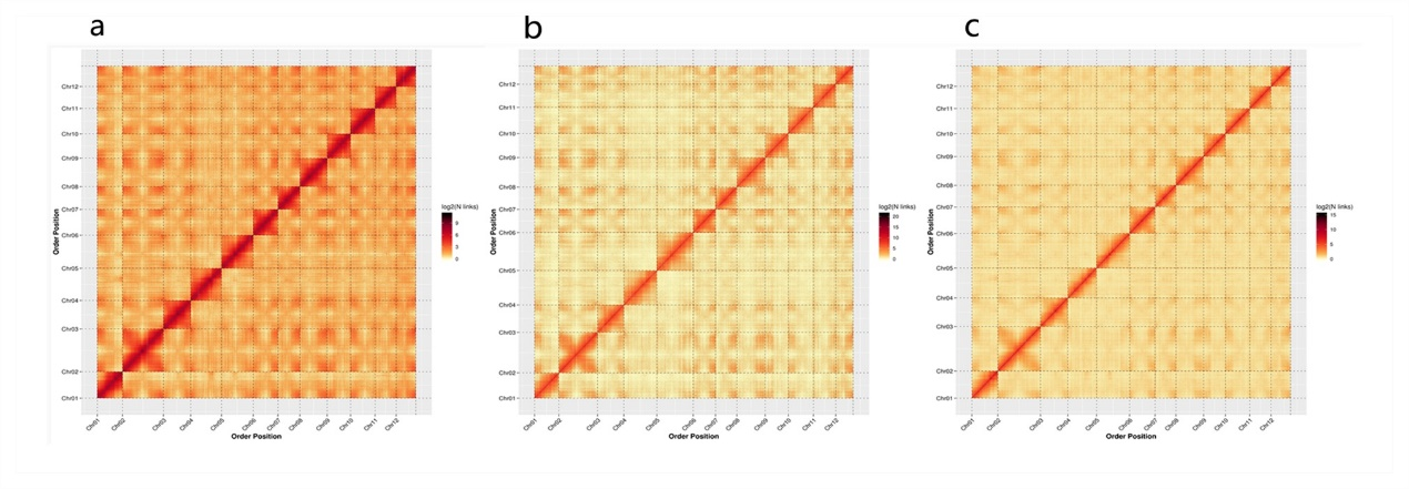 圖1 三個(gè)板栗品種基因組Hi-C熱圖、基因家族聚類(lèi)及基因PAV信息