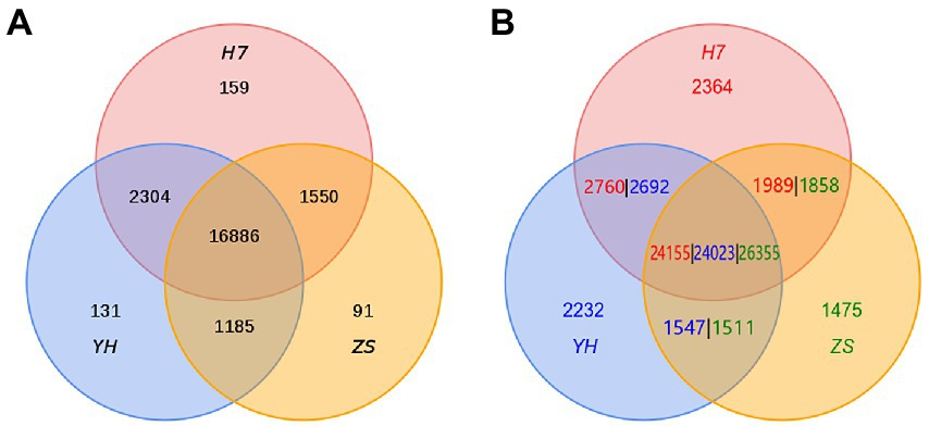 該研究以林果所自主選育的特色板栗良種 ‘燕紅’?(YH,易修剪品種)、‘燕山早生’(ZS,早熟品種) 和‘黑山寨7號(hào)’(H7,耐旱品種)為試驗(yàn)材料,基于納米孔測(cè)序技術(shù)(Nanopore)、Illumina HiSeq X和Hi-C技術(shù),獲得了三個(gè)高質(zhì)量染色體水平的板栗基因組。通過(guò)同源基因鑒定和基因家族聚類(lèi)分析,發(fā)現(xiàn)H7、YH和ZS分別有159、131和91個(gè)特有的基因家族。通過(guò)全基因組比對(duì)分析,尋找三個(gè)樣本基因組間的存在/缺失變異(PAV)信息,發(fā)現(xiàn)H7、YH和ZS中分別存在2364、2232和1475個(gè)特有基因(見(jiàn)圖1)。