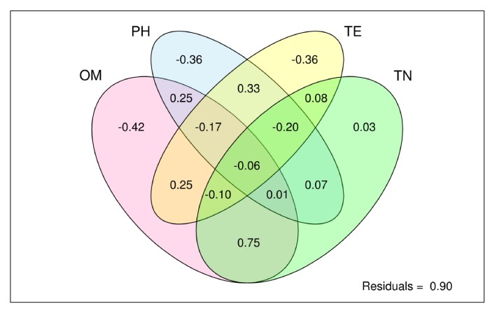 VPA分析(方差分解分析):VPA,全稱Variance Partitioning Analysis,中文稱為方差分解分析,該分析的目的是確定指定的環(huán)境因子對(duì)群落結(jié)構(gòu)變化的解釋比例。通常在CCA/RDA的排序分析方法可以得到所有參與分析的環(huán)境因子對(duì)群落變化的解釋比例。使用R語(yǔ)言vegan包(version:2.3-0),varpart函數(shù)進(jìn)行分析;分析前首先需要對(duì)環(huán)境因子進(jìn)行一個(gè)分類,一般支持2-4類,默認(rèn)使用大于等于2個(gè)環(huán)境因子進(jìn)行此分析。