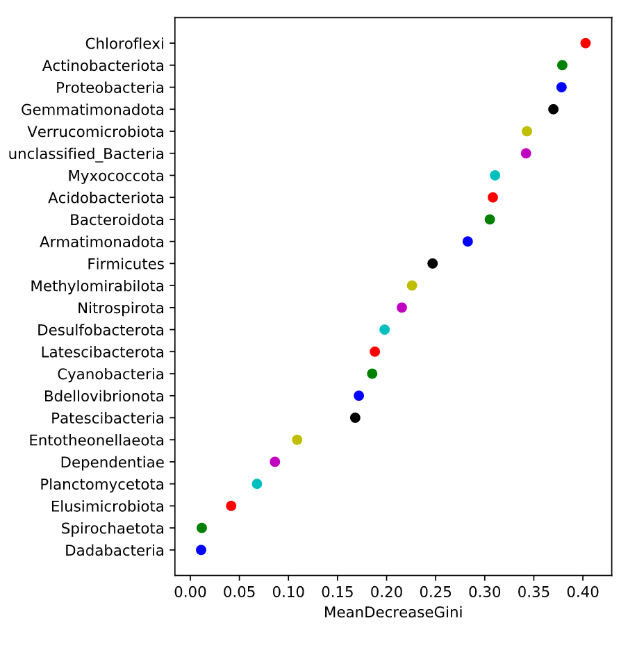 隨機(jī)森林分析:Random forest 分析,隨機(jī)森林指的是利用多棵樹(shù)對(duì)樣本進(jìn)行訓(xùn)練并預(yù)測(cè)的一種分類器,是機(jī)器學(xué)習(xí)的一種。利用隨機(jī)森林分析可以幫我們找到數(shù)據(jù)中重要的特征:在微生物組中就是哪些微生物組成可以作為特征進(jìn)行各種預(yù)測(cè);另外,隨機(jī)森林可以利用這些重要特征構(gòu)建模型用于分類預(yù)測(cè)(分類變量)或者回歸預(yù)測(cè)(數(shù)值型變量);隨機(jī)森林分析建議分組內(nèi)樣品至少30個(gè)以上,樣品數(shù)太少影響準(zhǔn)確性。 隨機(jī)森林分析,一般將數(shù)據(jù)劃分為訓(xùn)練數(shù)據(jù)集(train data)和測(cè)試數(shù)據(jù)集(test or validate data),訓(xùn)練數(shù)據(jù)集用于構(gòu)建預(yù)測(cè)模型,測(cè)試集用于查看模型的準(zhǔn)確性。