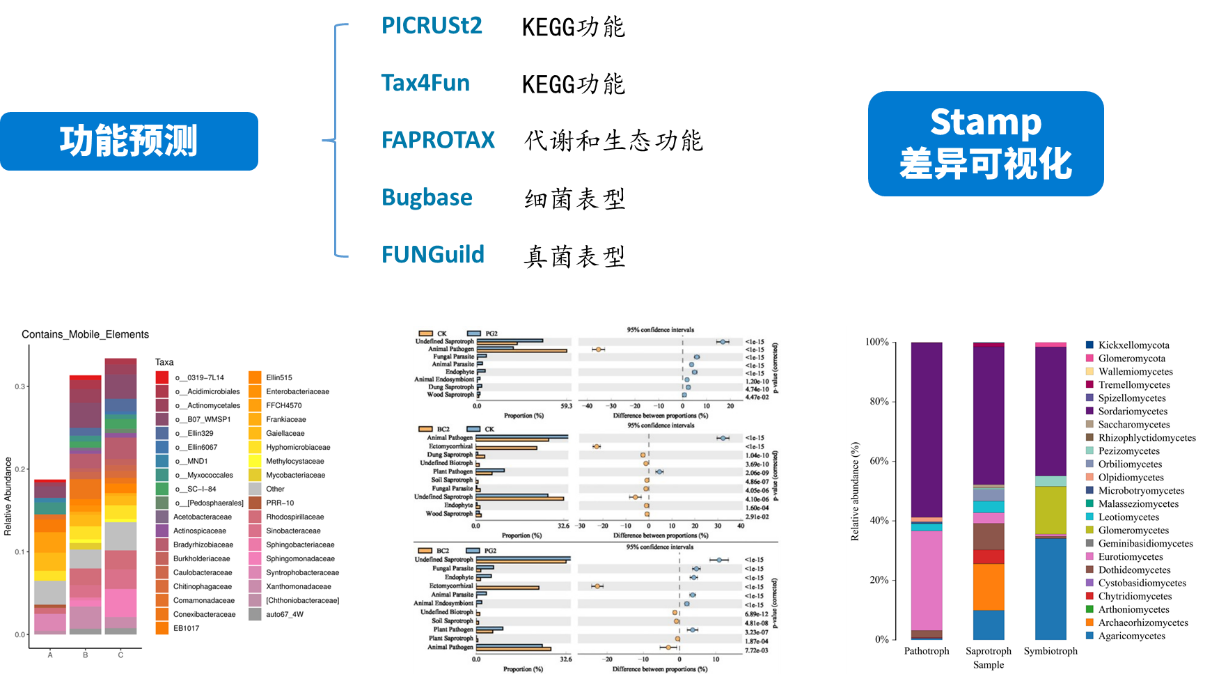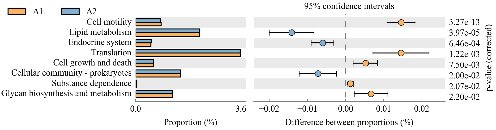 PICRUSt 2 將特征序列(16S rRNA)與微生物基因組數(shù)據(jù)庫(kù)(IMG,Integrated Microbial Genomes)參考序列對(duì)齊(aliign)構(gòu)建進(jìn)化樹(shù),找到特征序列的“最近物種”,并根據(jù)已知物種的基因種類和豐度信息預(yù)測(cè)未知物種的基因信息,從而結(jié)合基因的KEGG通路信息預(yù)測(cè)整個(gè)群落的通路情況。通過(guò)組間差異分析,得到在組間具有顯著差異的功能,最后利用Stamp對(duì)結(jié)果進(jìn)行差異可視化。