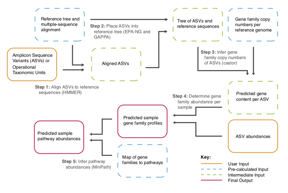 PICRUSt2 (Phylogenetic Investigation of Communities by Reconstruction of Unobserved States)是一款基于樣本中的標(biāo)記基因序列豐度來(lái)預(yù)測(cè)樣本功能豐度的軟件。這里的功能是指基因家族,如KEGG同源基因、EC酶分類號(hào)等,其原理如下圖: