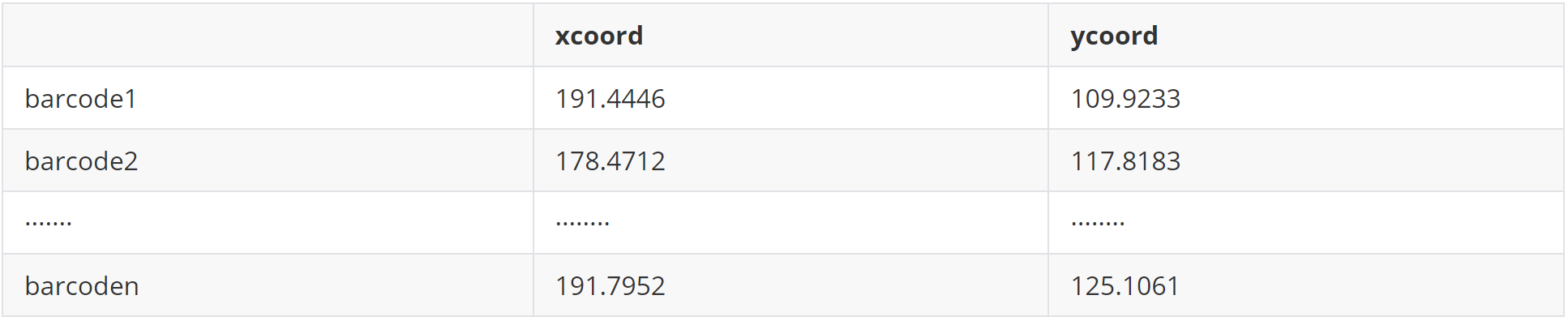 rownames(coords) <-?coords$barcodes; coords$barcodes?<-?NULL