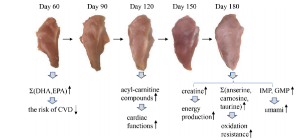 雞胸肉含有不飽和脂肪酸和較低的脂肪、鈉和膽固醇,是大家最喜歡肉類之一。近年來,隨著人們對(duì)食品營(yíng)養(yǎng)價(jià)值和自身健康的重視,研究者們開始致力于如何提高肉類質(zhì)量的研究,而生長(zhǎng)時(shí)期是影響雞肉質(zhì)量的重要因素,但不同時(shí)期哪些特定代謝物積累是影響雞肉品質(zhì)的關(guān)鍵還不清楚。本研究使用代謝組和轉(zhuǎn)錄組技術(shù),確定了特定代謝物積累的關(guān)鍵基因,有助于了解肉類質(zhì)量發(fā)展下的生物過程,并探索特定代謝物積累的有價(jià)值的生物標(biāo)志物。