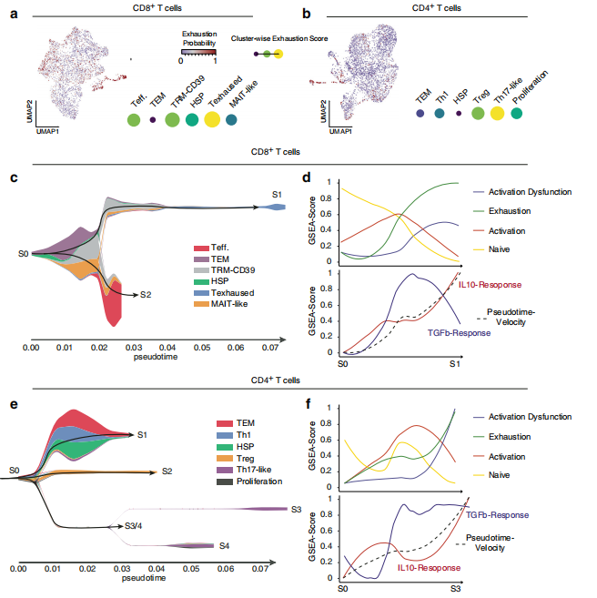該團(tuán)隊對?8?名診斷為新發(fā)膠質(zhì)母細(xì)胞瘤的患者腫瘤組織樣本進(jìn)行了單細(xì)胞測序和數(shù)據(jù)分析,發(fā)現(xiàn)“S1”狀態(tài)與?T?細(xì)胞耗竭/功能障礙標(biāo)志物(HAVCR2、CTLA4?和?PDCD1)的表達(dá)增加,為了確定與?T?細(xì)胞耗竭相關(guān)的轉(zhuǎn)錄途徑,進(jìn)行了通路信號傳導(dǎo)推斷,揭?示了?T?細(xì)胞耗竭與?IL-10?以及部分?TGF??反應(yīng)之間存在著相關(guān)性。