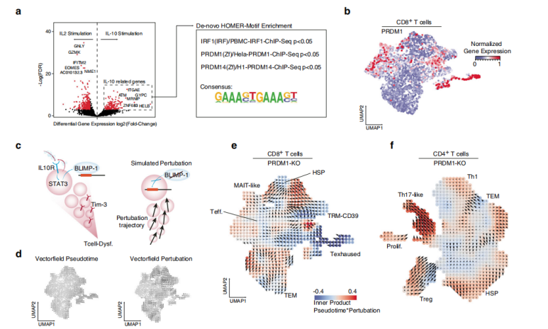 該團(tuán)隊通過擾動模擬,用IL-10刺激所產(chǎn)生scRNA-seq數(shù)據(jù)集富集分析推斷常見轉(zhuǎn)錄因子結(jié)合位點,發(fā)現(xiàn)ChiP-seq數(shù)據(jù)中基因BLIMP-1和IRF1峰之間密切重疊,IRF1和PRDM1/14結(jié)合位點的顯著富集,提出了“IL10-STAT3-BLIMP-1信號軸可能是腫瘤相關(guān)T細(xì)胞耗竭的潛在驅(qū)動因素”的假設(shè)。為了進(jìn)一步驗證猜想,作者對PRDM1進(jìn)行了計算機(jī)擾動模擬驗證,發(fā)現(xiàn)膠質(zhì)瘤母細(xì)胞瘤微環(huán)境中髓樣細(xì)胞分泌IL-10驅(qū)動誘發(fā)T?細(xì)胞耗竭。