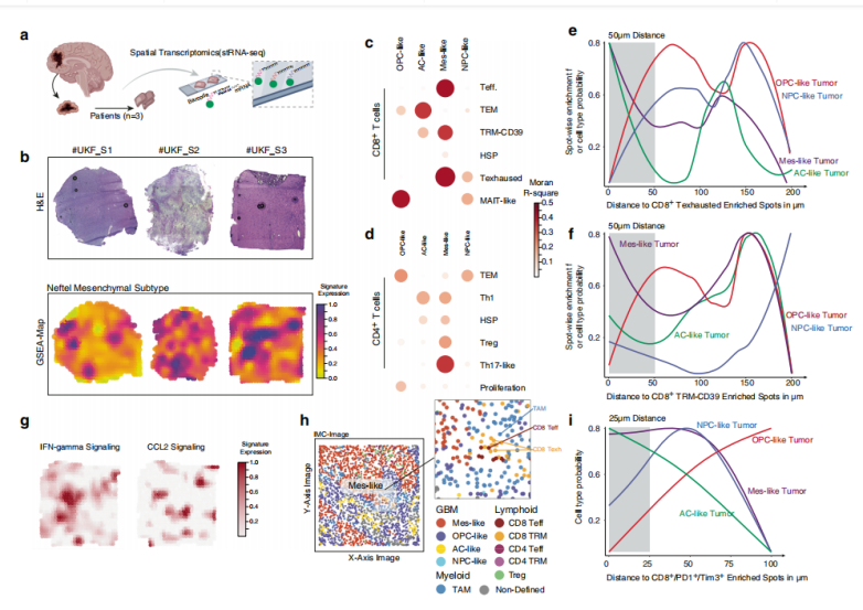 為了確定?T?細(xì)胞簇的空間位置信息,以及與特定腫瘤狀態(tài)共定位信息,作者進(jìn)行了空間分辨轉(zhuǎn)錄組RNA測序(stRNAseq)。該團(tuán)隊收集3名原發(fā)性GBM IDH1/2 Wt患者組織樣本,數(shù)據(jù)集總共包含2352個測序點,每個點的中位數(shù)為8個細(xì)胞(范圍:每個spot點捕獲4~22個細(xì)胞)。作者通過NMF回歸和Moran統(tǒng)計分析,發(fā)現(xiàn)CD8+T細(xì)胞簇與GBM亞型相關(guān)聯(lián),腫瘤區(qū)域富集為間充質(zhì)樣腫瘤(MES樣),星形膠質(zhì)細(xì)胞樣(AC樣)轉(zhuǎn)錄特征與活化的CD8+效應(yīng)子、CD8+T耗盡簇共定位。