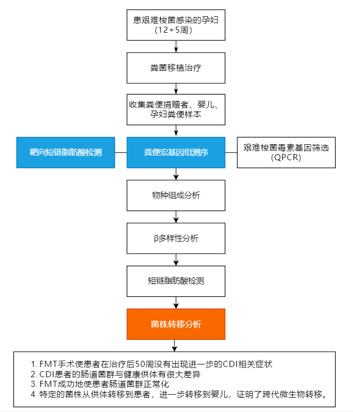 該研究通過(guò)對(duì)糞便捐獻(xiàn)者、孕婦和嬰兒的糞便樣本進(jìn)行宏基因組測(cè)序和菌株水平分析,并進(jìn)一步與收集的651名健康嬰兒和58名健康成年人的宏基因組樣本進(jìn)行比較,發(fā)現(xiàn)一些特定的菌株從捐贈(zèng)者轉(zhuǎn)移到患者身上,然后轉(zhuǎn)移到嬰兒,證明了跨代微生物轉(zhuǎn)移。