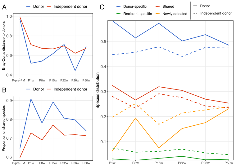研究者進(jìn)一步將患者 FMT 后腸道微生物群分為四類,即共有的、供體特異性的、受體特異性的和新檢測(cè)到的(圖2C)。結(jié)果表明,供體特定物種的百分比高,在第 1 周占 58.3%,并且在研究期間大致保持穩(wěn)定。相比之下,當(dāng)在這些分析中使用獨(dú)立供體代替實(shí)際供體時(shí),供體特定和共享物種的比例在所有采樣時(shí)間點(diǎn)都較低。此外,在 FMT 后跟蹤了轉(zhuǎn)移的供體特異性物種,發(fā)現(xiàn)其中超過(guò) 80% 的物種可以成功轉(zhuǎn)移并維持到 50 周,遠(yuǎn)高于獨(dú)立捐贈(zèng)者。由于供體特異性物種的轉(zhuǎn)移,根據(jù) BrayCurtis 相異性,F(xiàn)MT 后患者的腸道菌群組成與基線時(shí)(P-FMT 前)不同。盡管供體特異性物種在數(shù)量上所占比例大,但它們的豐度很低,并且主要來(lái)自擬桿菌科、毛螺菌科、梭菌科和瘤胃球菌科。因?yàn)樨S度高的物種同時(shí)存在于供體和 preFMT 樣本中,無(wú)法檢測(cè)到細(xì)菌在物種水平上的轉(zhuǎn)移;因此,有必要對(duì)微生物轉(zhuǎn)移進(jìn)行更深入的研究。