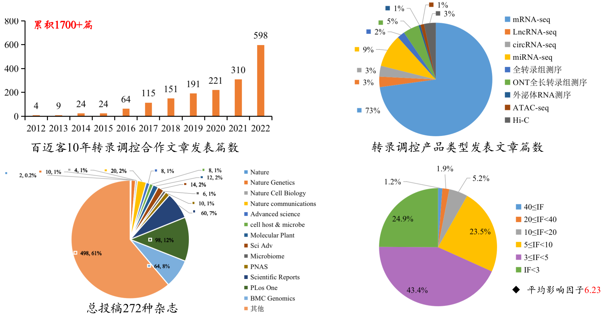 百邁客轉(zhuǎn)錄調(diào)控合作項(xiàng)目文章持續(xù)爆發(fā)增長,累積1700篇,2022年度收錄598篇,總IF高達(dá)3500+,平均影響因子6.23。