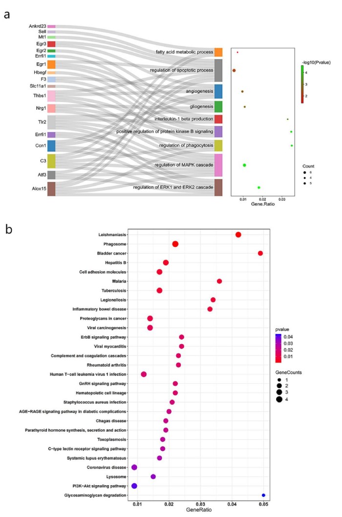 采用Gene Ontology(GO)與Kyoto Encyclopedia of Genes and Genomes(KEGG)對MOTS-c所改變的47個(gè)致病基因進(jìn)行功能富集分析。GO 注釋系統(tǒng)包含三個(gè)主要分支,即:生物學(xué)過程(BP)、分子功能(MF)和細(xì)胞組分(CC)。)8 周 MOTS-c 注射所改變的 47 個(gè)糖尿病致病基因共富集于 195 個(gè) GO term 中,其中 188 個(gè) term 富集于 BP,2 個(gè) term 富集于 CC,5 個(gè) term 富集于MF。經(jīng)過 ClueGO 聚類分析后,195 個(gè) term 主要富集于 9 個(gè)類別(見圖 5b),分別為血管生成(angiogenesis)、凋亡過程調(diào)控(regulation of the apoptotic process)、MAPK 級聯(lián)調(diào)控(regulation of MAPK cascade)、蛋白激酶活性正調(diào)控(positive regulation of protein kinase activity)、脂肪酸代謝過程(fatty acid metabolic process)、吞噬作用調(diào)節(jié)(regulation of phagocytosis)、蛋白激酶 B 信號正調(diào)控(positive regulation of protein kinase B signaling)、ERK1/2 級聯(lián)(regulation of ERK1/2 cascade)、膠質(zhì)生成(gliogenesis)和白細(xì)胞介素-1 的產(chǎn)生(interleukin-1 beta production)。KEGG通路富集分析顯示,18條KEGG通路顯著富集(圖5b),其中5條信號通路與免疫、凋亡和糖代謝相關(guān)(ErbB信號通路、補(bǔ)體和凝血級聯(lián)、c型凝集素受體信號通路、PI3K-Akt信號通路和AGE-RAGE信號通路)。在功能富集通路注釋基因中,ALOX15、ATF3、CCN1、EGR1、EGR3、ERRFI1、THBS1、TLR2和NRG1高頻率注釋。CCN1與EGR1基因高表達(dá),同時(shí)均注釋在凋亡相關(guān)的GO term中,而CCN1也注釋于富集顯著性最高的ERK1/2級聯(lián)通路中,表明CCN1、ERK1/2與EGR1可能是相互關(guān)聯(lián)的關(guān)鍵基因。
