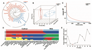 對(duì)26個(gè)典型的枇杷栽培種質(zhì)資源(代表全球不同地區(qū)的栽培種質(zhì)資源)和11個(gè)來(lái)自中國(guó)西南地區(qū)的野生種質(zhì)資源進(jìn)行了全基因組重測(cè)序,平均深度為22.49×,共鑒定出10,978,138個(gè)高質(zhì)量的SNP。系統(tǒng)發(fā)育和主成分(PCA)分析表明,野生種質(zhì)和栽培種質(zhì)聚為兩個(gè)不同的組(圖3A和B)。野生枇杷的核苷酸多樣性(π)(2.28×10?3)高于栽培枇杷(1.44×10?3),LD衰減速度快于栽培枇杷(圖3C),期望雜合度和觀測(cè)雜合度的平均值均顯著高于栽培枇杷。進(jìn)一步利用Structure對(duì)種群結(jié)構(gòu)分析顯示,當(dāng)K=2時(shí),所有個(gè)體被清楚地細(xì)分為野生和栽培種質(zhì)的兩個(gè)特定分支(圖3D)。
