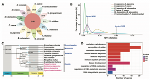 為研究野生枇杷基因組特征及進(jìn)化,作者將其與藍(lán)星睡蓮、水稻、鐵皮石斛、番茄,茶樹、獼猴桃、蘋果、白梨、野草莓、擬南芥,杧果和葡萄基因組進(jìn)行比較基因組分析,通過(guò)基因家族聚類,發(fā)現(xiàn)92%(42,150)的蛋白編碼基因聚為20,668個(gè)基因家族,其中523個(gè)基因家族為枇杷特有的單拷貝(圖2A),主要參生物學(xué)質(zhì)量調(diào)控、激素水平、定位、運(yùn)輸和生長(zhǎng)素極性運(yùn)輸?shù)壬镞^(guò)程。通過(guò)4DTv和Ks對(duì)全基因組復(fù)制事件分析表明,枇杷基因組中發(fā)生了兩次全基因組復(fù)制(WGD)事件,最近的WGD事件發(fā)生在30-45 Mya,而古WGD可能發(fā)生在已知的約120~130 Mya的古六倍化WGT(γ)事件。系統(tǒng)分化表明,枇杷與蘋果和梨擁有共同的祖先,這三個(gè)物種的分化發(fā)生在最近的一次WGD事件之后,通過(guò)比較分析,枇杷基因組104個(gè)基因家族發(fā)生擴(kuò)張,僅有一個(gè)基因家族發(fā)生收縮,GO富集分析表明,發(fā)生擴(kuò)張的基因家族主要參與花粉識(shí)別、分生組織發(fā)育與維持、免疫反應(yīng)、和DNA代謝過(guò)程的調(diào)節(jié)等生物過(guò)程;KEGG分析表明,主要參與半乳糖代謝、氨基酸代謝、氨基糖/核苷酸糖代謝、氮代謝、不飽和脂肪酸生物合成等通路。收縮的基因家族的生物學(xué)過(guò)程只參與了蛋白質(zhì)磷酸化。