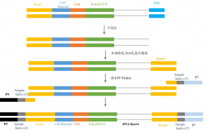 接下來進(jìn)入單細(xì)胞測序的第三環(huán)節(jié)–文庫構(gòu)建。文庫構(gòu)建可分為三個(gè)部分:DNA片段化/末端修復(fù)/添加A尾、接頭連接和Index PCR(PCR富集)。