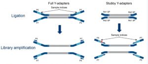 隨后對修復(fù)后的片段進(jìn)行接頭連接,主要是利用DNA連接酶,將3’端帶有dA的DNA片段與adapter接頭進(jìn)行連接。接頭的分類有兩種方式: