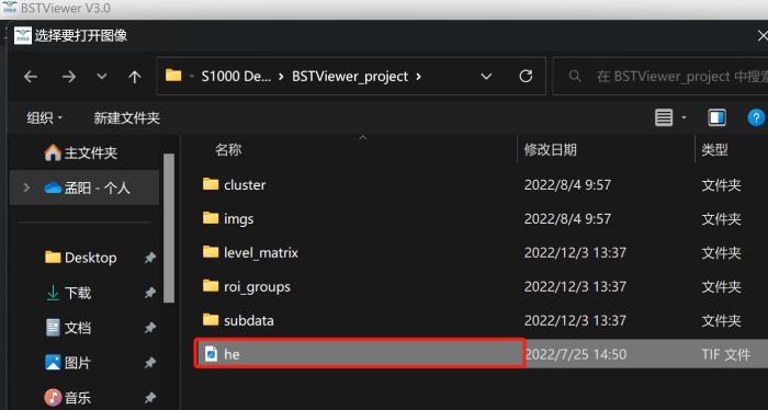 1)將官網(wǎng)下載到的BSTViewer_project文件夾數(shù)據(jù)(或者通過(guò)運(yùn)行BSTMatrix 得到的BSTViewer_project 文件夾)存放到英文命名的文件夾之中;【包括各個(gè)級(jí)別分辨率矩陣文件,及BMChiper 或者官網(wǎng)下載的HE 染色圖片】可以同時(shí)在此文件夾下邊新建一個(gè)outdir 作為文件輸出路徑;