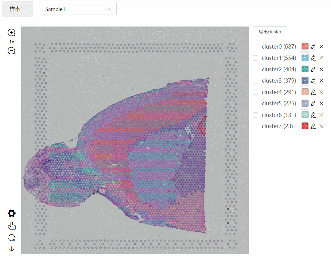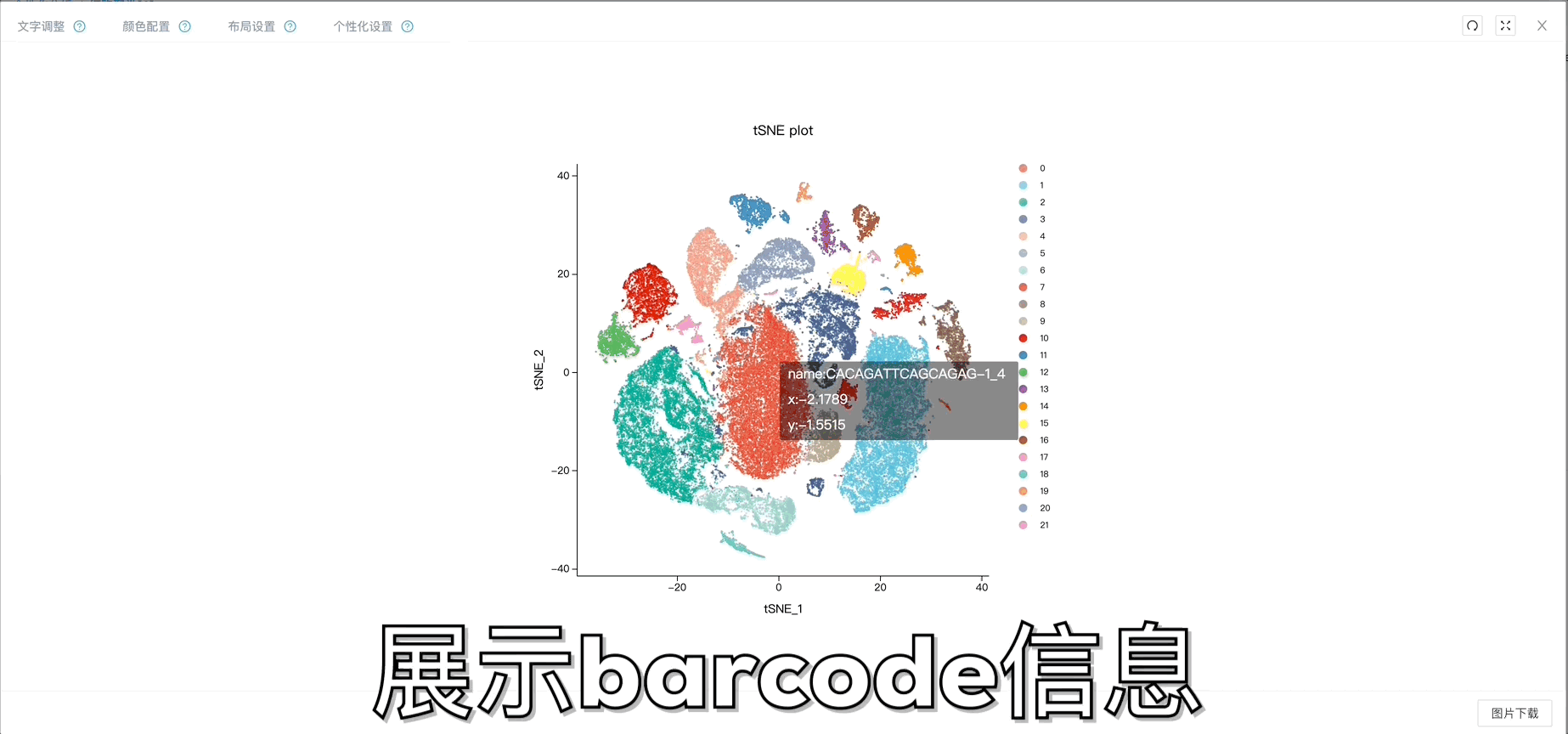 篩選到有效細(xì)胞后,可以基于細(xì)胞的基因表達(dá)矩陣,進(jìn)行細(xì)胞聚類(lèi)分析。細(xì)胞聚類(lèi)交互圖可展示UMAP/TSNE圖,調(diào)整點(diǎn)的大小,點(diǎn)配色,文字等交互圖樣式可自定義,具體見(jiàn)下圖及圖中的描述。