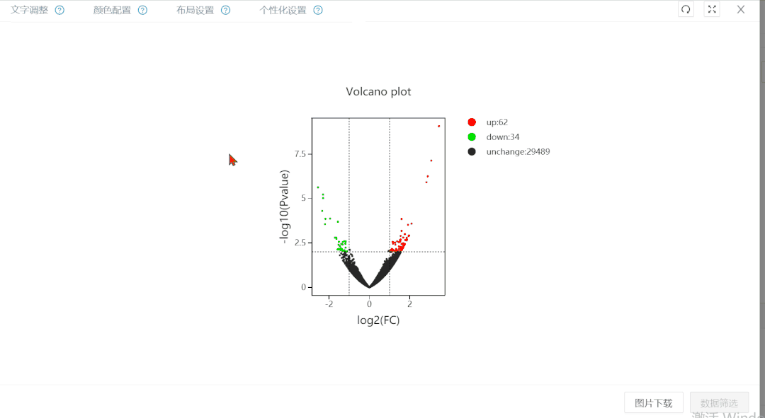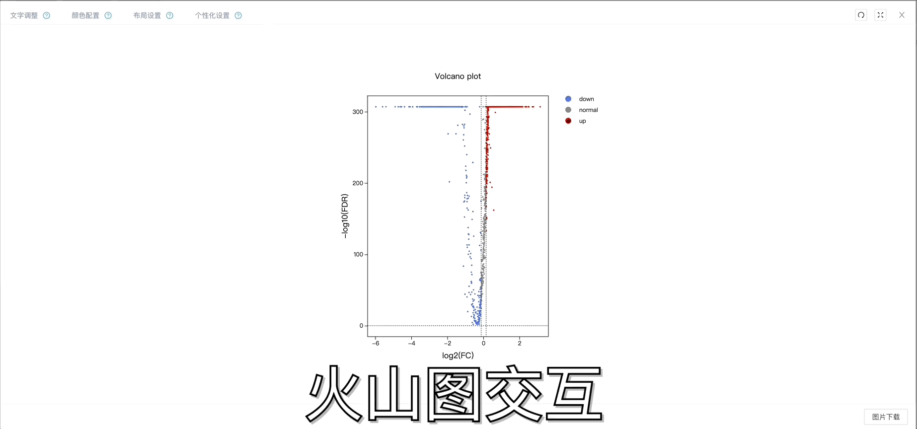 火山圖(Volcano Plot)可以快速地查看基因/物質(zhì)在兩個(gè)(組)樣品中表達(dá)水平的差異。火山圖的交互式支持自定義展示一定數(shù)目的重點(diǎn)差異基因,還支持支持選擇重點(diǎn)差異基因進(jìn)行數(shù)據(jù)篩選,進(jìn)行二次數(shù)據(jù)處理。