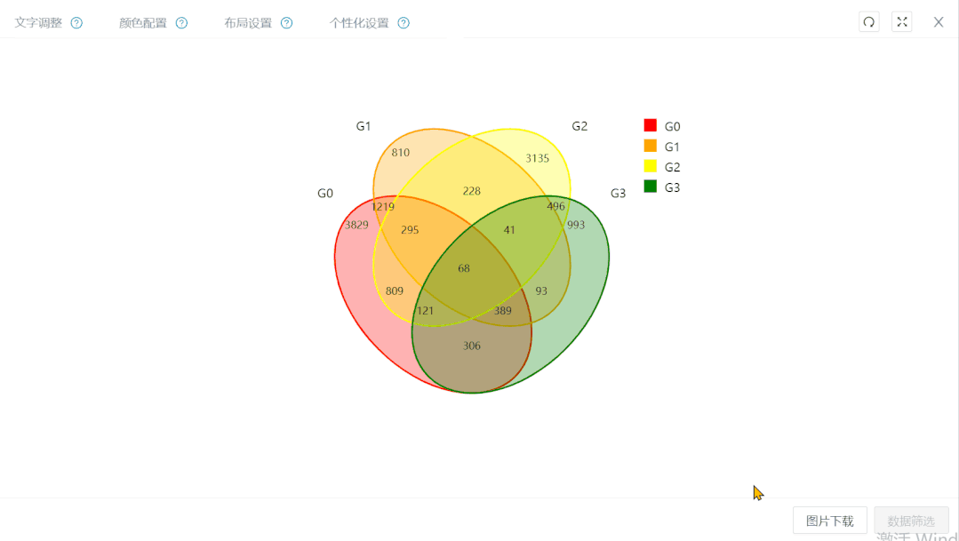 通常會(huì)對(duì)差異的基因/物質(zhì)做簡(jiǎn)單的韋恩圖繪制,也可以對(duì)總體的基因/物質(zhì)進(jìn)行繪圖。交互韋恩圖的功能非常靈活,2-5個(gè)分組自動(dòng)繪制韋恩圖,5-32個(gè)自動(dòng)為花瓣圖,支持經(jīng)典韋恩圖、齒輪圖的更換,還支持?jǐn)?shù)字點(diǎn)擊進(jìn)行下級(jí)數(shù)據(jù)的二次篩選交互。