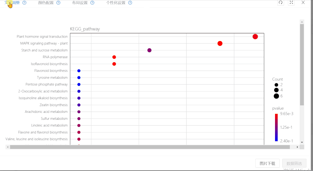氣泡圖是富集分析后的重要展示手段,交互氣泡圖常用于GO和KEGG氣泡圖,支持Pvalue/Qvalue以及rich_factor/GeneRatio的自由切換,支持圖片選擇重點(diǎn)富集通路進(jìn)行數(shù)據(jù)篩選,進(jìn)行二次數(shù)據(jù)處理。