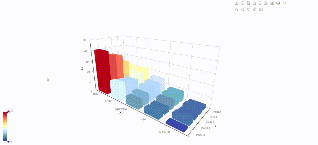 一次繪圖,多圖自由轉(zhuǎn)換。排列柱狀圖、堆疊柱狀圖、排列點(diǎn)線圖、堆疊點(diǎn)線圖、3D柱狀圖等互相自由切換。同時(shí),只需點(diǎn)擊下legend圖例,即可取消掉過(guò)多的展示項(xiàng),從而達(dá)到重新繪制的目的。滾動(dòng)下鼠標(biāo),即可隱藏過(guò)多的樣品展示。