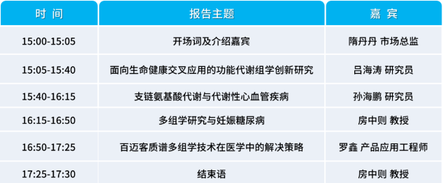 2023年3月22日中國生物物理學會腸道菌群分會房中則副秘書長牽頭與百邁客生物聯(lián)合舉辦“?質譜技術與多組學前沿應用線上研討會”。本次研討會由百邁客醫(yī)學市場總監(jiān)隋丹丹主持,邀請了上海交通大學系統(tǒng)生物醫(yī)學研究院呂海濤研究員,天津醫(yī)科大學孫海鵬研究員,天津醫(yī)科大學房中則教授,共同探討質譜多組學技術在疾病研究中應用。