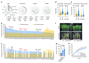 為了確定CIMBL55抗旱性的遺傳機理,本研究在泛基因組水平上研究了25個NAM建立系和另外4個玉米品系SK、Mo17、K0326、A188的遺傳變異。共得到17,581,014個結(jié)構(gòu)變異(SVs)(圖3a)。為了更深入地了解CIMBL55的基因組變異,以CIMBL55為參考,在B73和Mo17中鑒定到841,911個DNA變異(>20 bp)。隨后,在368份玉米自然群體中,成功對544,853個SVs進行了基因型鑒定,并基于干旱后的幼苗存活率對其耐旱性進行了分析。