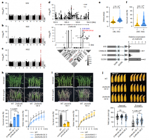 研究發(fā)現(xiàn),位于ZmABF4基因第二內(nèi)含子的SNP (S1474)和SV (S3205, 42 bp)與該基因的表達(dá)和苗期抗旱性密切相關(guān)。ZmABF4編碼bZIP轉(zhuǎn)錄因子,為ABA和干旱誘導(dǎo)表達(dá)的主要調(diào)節(jié)因子。攜帶ZmABF4CIMBL55等位基因的種質(zhì)在基因表達(dá)和抗旱性方面明顯高于攜帶ZmABF4B73等位基因的種質(zhì)(圖3d, e)。轉(zhuǎn)基因過表達(dá)分析發(fā)現(xiàn),與野生型(WT)相比,ZmABF4轉(zhuǎn)基因株系在干旱脅迫下存活率顯著提高,葉片失水率降低(圖3f-h)。說明ZmABF4對玉米抗旱性具有正向調(diào)控作用,?ZmABF4CIMBL55可能是玉米抗旱性的優(yōu)異等位基因。