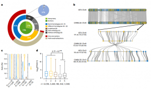基因共線性反映了不同基因組間的基因含量及其在染色體上的排列。CIMBL55與B73基因組之間的共線基因分析表明,73%的CIMBL55基因位于共線基因塊,27%的基因是非共線基因。共線基因進一步可以分為三類。1類基因(42%)位于B73和CIMBL55的同源染色體上,多數(shù)為單拷貝基因(one-one syntenic)。2類基因(29%)是位于各自基因組中兩條不同同源染色體上的重復(fù)基因(multi–multi synteny)(圖2b)。3類基因(2%)位于CIMBL55當(dāng)前組裝中未定位到染色體上的contigs中,但與B73中的相應(yīng)基因處于共線性塊中。非共線基因包括class 4(16%)和class 5(11%)2類基因。