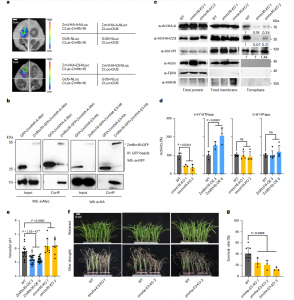 為了解ZmRtn16的生物學(xué)功能,亞細(xì)胞定位分析發(fā)現(xiàn)ER標(biāo)志物與ZmRtn16-GFP融合蛋白共定位在ER中,表明ZmRtn16-GFP在ER中發(fā)揮作用。免疫共沉淀(co-IP)顯示ZmRtn16能與液泡膜H+-ATPase復(fù)合體A (ZmVHA-A)和E3亞基?(ZmVHA-E3)相互作用。隨后,通過比較zmrtn16-crispr和WT株系的ZmVHA-A和ZmVHA-E3亞細(xì)胞定位,發(fā)現(xiàn)ZmRtn16可以促進ZmVHA-A和ZmVHA-E3的液泡膜定位(圖6c)。此外,與WT植物相比,ZmRtn16-OE株系液泡質(zhì)子泵活性較高,而ZmRtn16-KO株系液泡質(zhì)子泵活性較低(圖6e),突出了液泡質(zhì)子泵在抗旱性上的作用。綜上所述, CIMBL55基因組中ZmRtn16基因3′ -UTR中28 bp缺失,可能增強ZmRtn16的表達(dá),促進了ZmVHA-A和ZmVHA-E3在液泡膜中的定位,從而提高玉米的抗旱性。