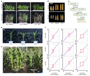 此前研究中,基于全基因組關(guān)聯(lián)分析(GWAS)和孟德爾隨機化分析分別鑒定了42個和97個抗旱性候選基因。作者在CIMBL55基因組中對這些位點的基因型進行研究,鑒定得到108個抗旱基因。值得注意的是,在CIMBL55中發(fā)現(xiàn)了65個基因的優(yōu)異單倍型,解釋了CIMBL55優(yōu)良抗旱性的遺傳基礎(chǔ)。此外,在108個基因中,有11個候選基因在非CIMBL55等位基因中被鑒定為優(yōu)勢單倍型,這表明其他種質(zhì)可能含有與CIMBL55互補的玉米抗旱性遺傳資源(圖3b)。