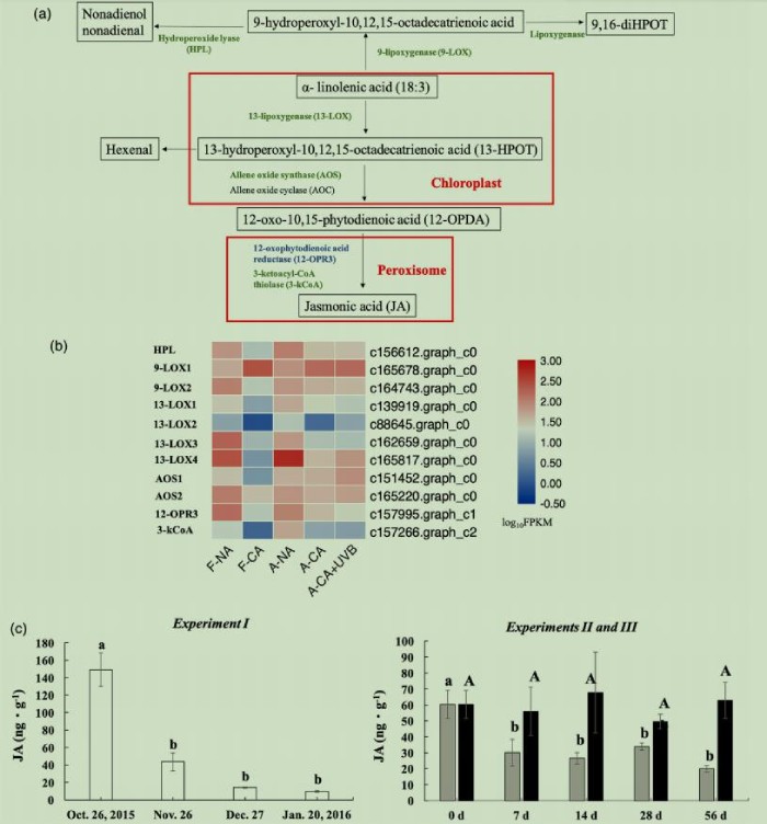 試驗I的茉莉酸含量在10月26日至1月20日期間大幅度下降了93%,試驗II在0~56天期間下降了66%;而在試驗III中,沒有明顯變化(圖4c)。AtLOX2和AtCYP74A(alleneoxidesynthase,AOS)已被證明是擬南芥JA生物合成的關(guān)鍵酶,其中任何一種的缺失都會抑制JA的生物合成。此外,NaLOX3參與了煙草中JA的積累。本研究中,13-LOXs和AOSs在試驗I和II中均下調(diào)(圖4b),表明抑制亞麻酸的消耗可能是為了在應(yīng)對低溫時保持膜的流動性。UVB被證明可以誘導(dǎo)擬南芥中JA的生物合成。因此,低溫抑制JA生物合成,而UVB處理可能導(dǎo)致整個試驗III中JA含量穩(wěn)定(圖4c)。